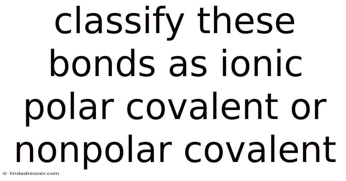 Understanding the classification of bonds is essential for grasping the fundamental principles of chemistry. When we explore the nature of chemical bonds, we often encounter three main categories: ionic, polar covalent, and nonpolar covalent. Each of these bond types has a big impact in shaping the behavior of substances, influencing their properties, and determining how they interact with the world around them. In this article, we will break down the characteristics that define these bonds, how they form, and why knowing them matters for students and learners alike The details matter here. That's the whole idea..