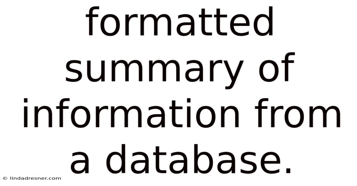 Formatted summary ofinformation from a database is a concise, structured representation that transforms raw data into a reader‑friendly output. This meta description introduces the core concept: a formatted summary of information from a database that highlights key fields, aggregates values, and presents them in a logical flow, making complex datasets easily digestible for analysts, developers, and end‑users alike.