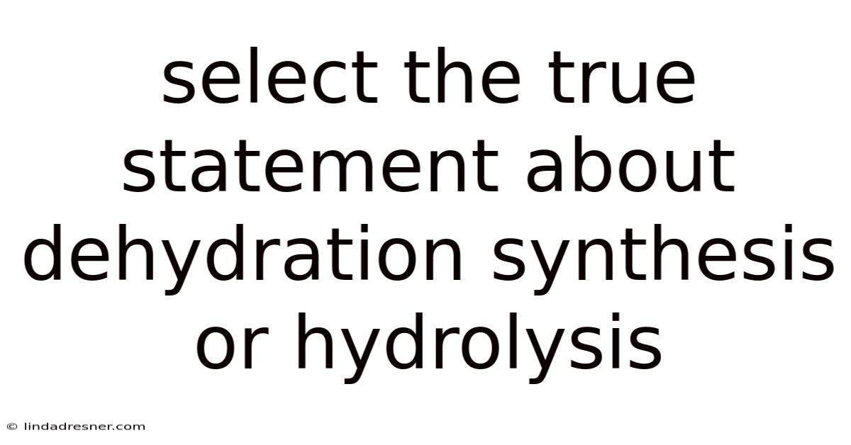 When discussing chemical reactions in biology or chemistry, terms like dehydration synthesis and hydrolysis often come up. On the flip side, distinguishing between them can be challenging, especially when presented with multiple statements. These processes are fundamental to understanding how molecules are built or broken down in living organisms. The key to selecting the true statement lies in grasping the core principles of each process. This article will break down the concepts, highlight their differences, and provide a framework for identifying accurate statements about dehydration synthesis or hydrolysis Took long enough..