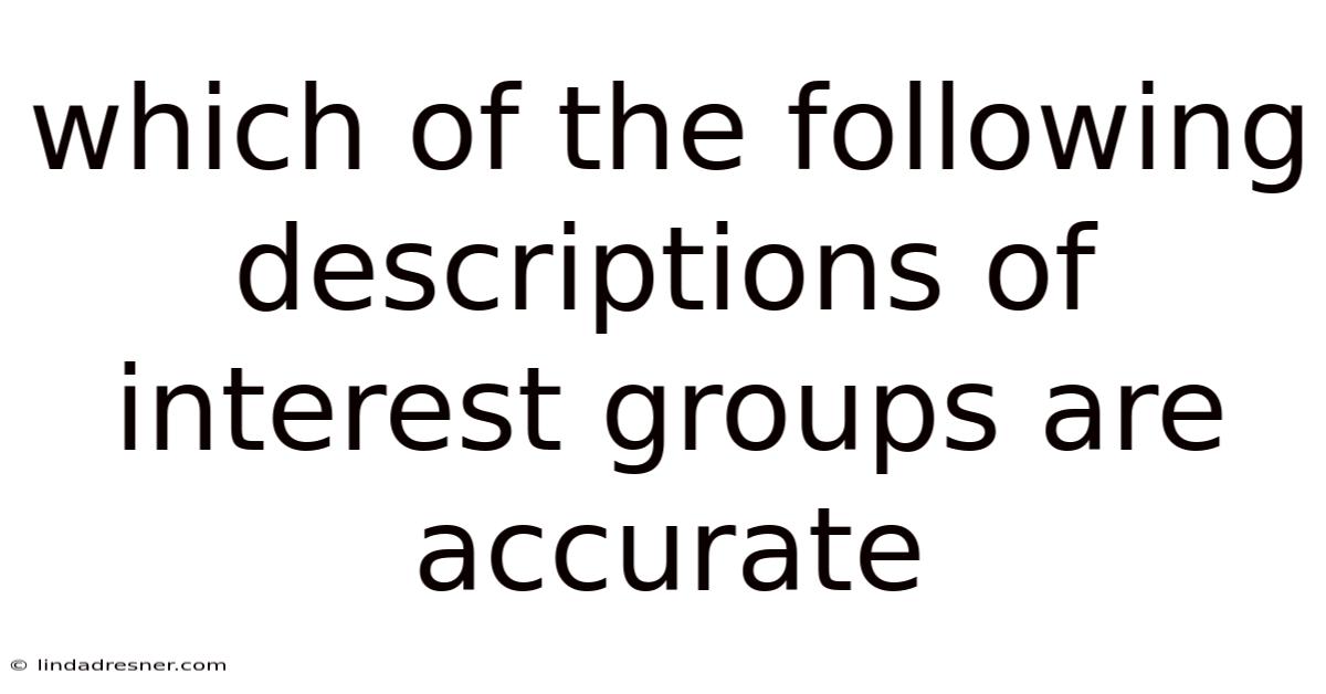 The landscape of modern society is continually evolving, shaped by the dynamic interplay of various social forces, economic shifts, and political developments. On top of that, within this involved web, interest groups emerge as critical actors, often operating as informal or formal entities designed to influence policy, advocate for specific causes, or shape public discourse. These groups serve as conduits for collective action, bridging individual interests with broader societal goals. Whether through lobbying efforts, grassroots mobilization, or strategic partnerships, interest groups play a nuanced role in the democratic process. That's why their existence raises critical questions about representation, accountability, and the balance of power within institutions. Understanding the nature of interest groups is essential for comprehending how they interact with governmental bodies, civil society, and the public at large. This article digs into the multifaceted descriptions of interest groups, evaluating their accuracy and the criteria that determine their legitimacy as legitimate representatives of collective interests. By examining the distinctions between different types of groups, assessing their methodologies, and analyzing real-world applications, this exploration aims to provide clarity on which portrayals align with factual integrity and genuine advocacy. Such insights are not merely academic exercises but practical tools for navigating the complexities of civic engagement and political participation.